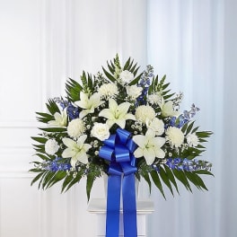 Price: $139.99 Heartfelt Sympathies Blue & White Funeral Standing Basket Product Tags: Next-day Delivery